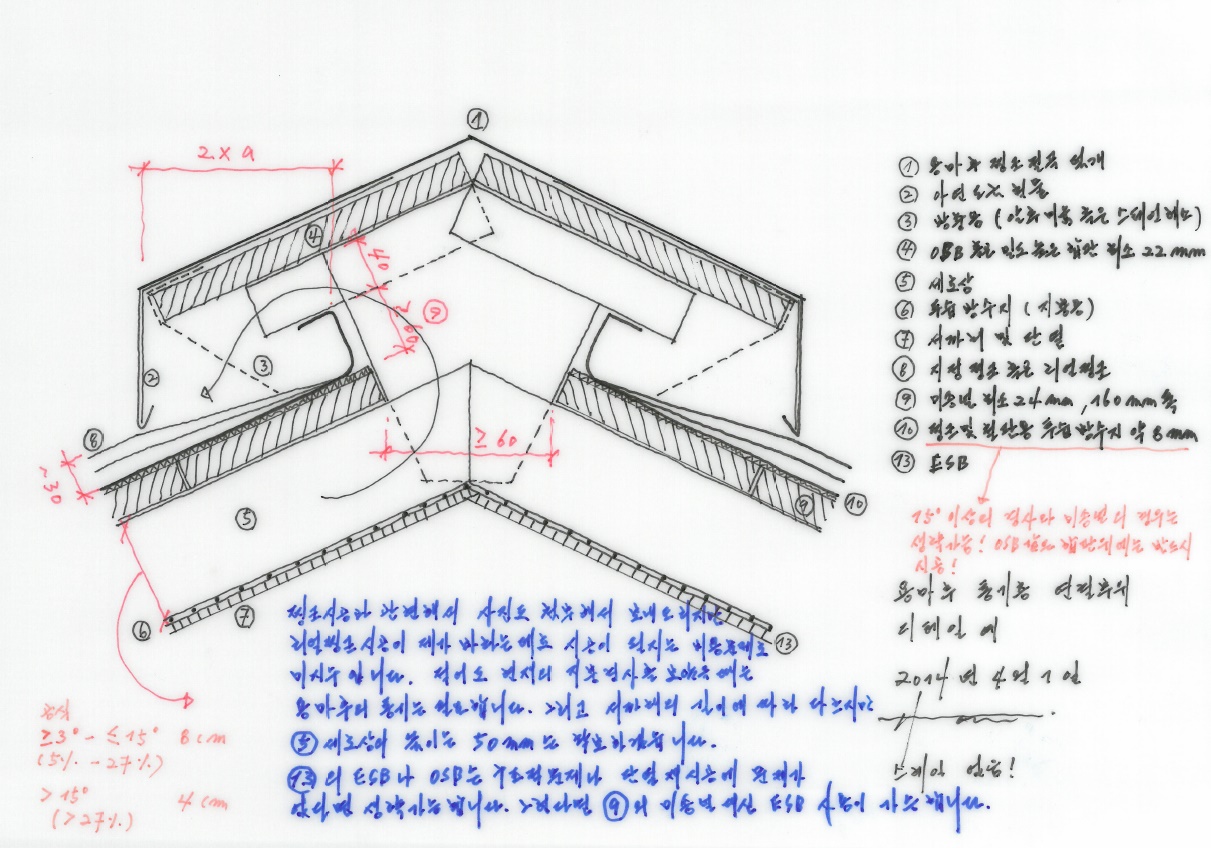 2. 외부통기지붕을 이해 하고 계시는지.. 즉, 통기층이 투습방수지위에서 형성되는 것임을 알고 계시는 것인지...
