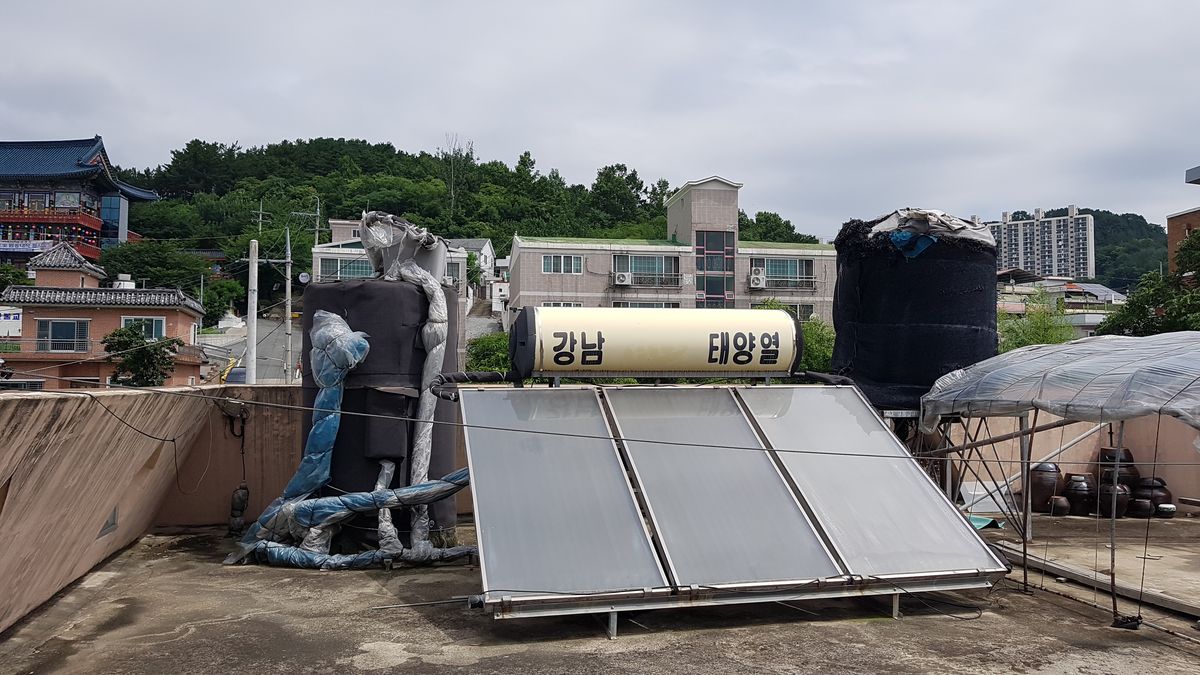 태양열이라고 하시면, 지붕 위에 물통이 일체화된 제품을 이야기하시는 것인지, 아니면 기계실에 별도의 온수탱크가 있는 것을 의미하시는지 궁금합니다.