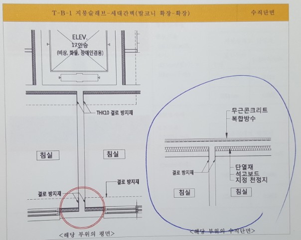 결로방지 상세가이드 지침을 보면 지붕층에서 내부벽과 지붕층이 만나는 부위는 해당부위(발코니 접합면)에만 결로방지 처리를 하도록 되어 있는데 내부벽과 지붕층이 만나는 내부(점선부위)에는 지침상 결로방지처리를 해야될 필요가 없는지요?