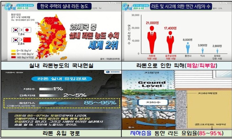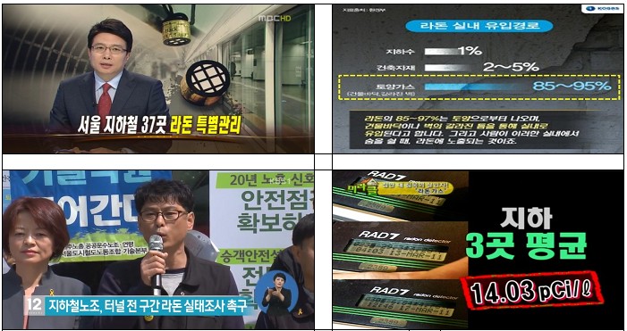 아래 사진은공사중 습득한  지하공간 라돈발생관련 공중파 방송 자료입니다, 최근 보도자료를 보니 우리나라 지하공간의 라돈함유량이 세계 29개국중 2위라 합니다..작년 한해 라돈에 의한 폐암 사망자가 2만 7천명이라네요 제2의 가습기 살균제라 할만 하네요