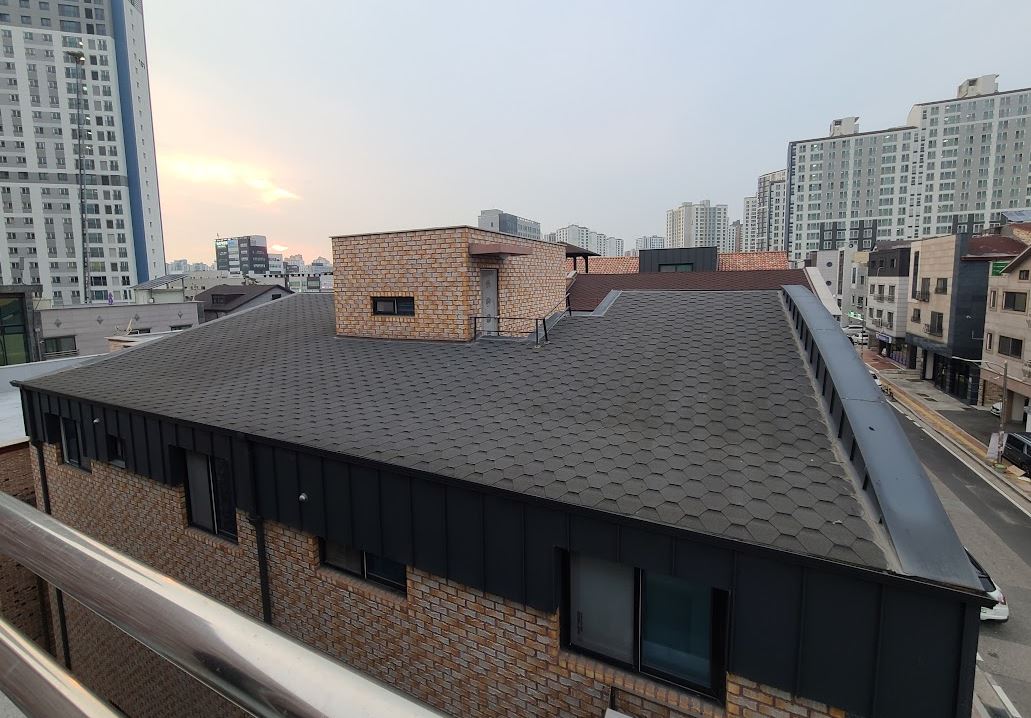 정확한 각도는 모르겠으나 벽면 대리석 높이에 끝단을 맞추려고 슁글 아래부분에 목공하지 작업 후 합판을 붙혀 아스팔트슁글을 부착했습니다. 사진으로 봐도 대충 완만한 부분을 보실 수 있습니다.