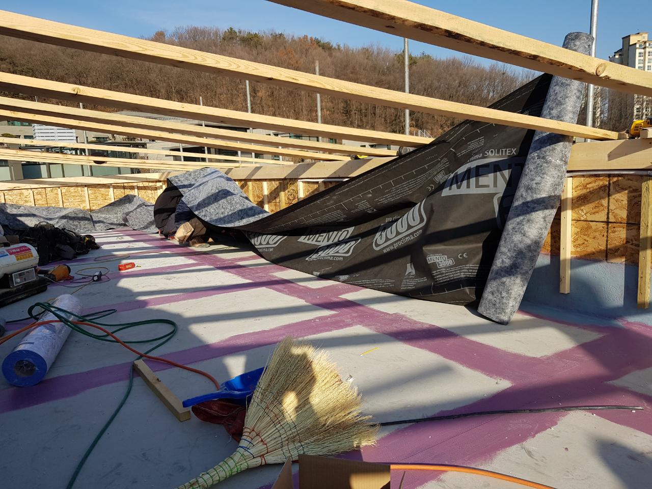 3. 경사지붕의 경우 지붕용투습방수지는 큰 의미가 없습니다만, 경사면과 벽면의 연결부위가 어떻게 되느냐에 따라서 필요할 수도 있으므로 일단은 두는 것으로 판단하였습니다.