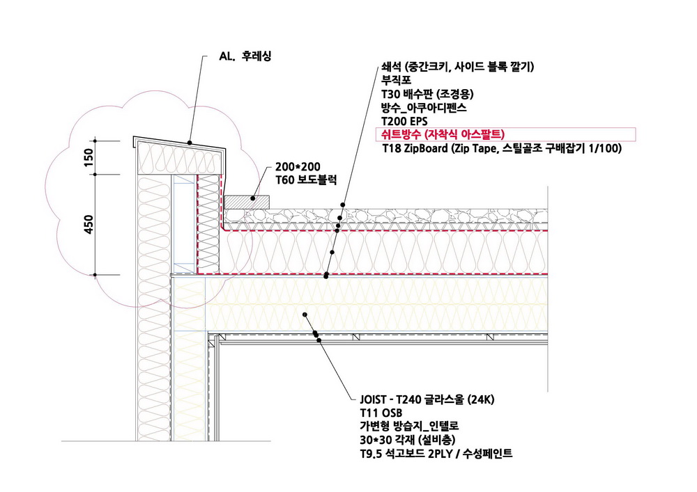 평지붕의 CRC보드를 빠뜨렸었네요. 그런데 판교 시공 자료에서 CRC보드를 고정하지 않고 단열재위에 올려만 놓고 방수를 했다고 하셨는데...