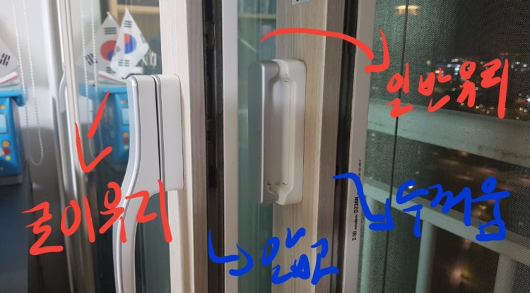 안쪽창과 바깥창을 바꾸어 설치해보라 하시네요. 그런데 손잡이가 달라서 바꿀수는 없겠더라구요.