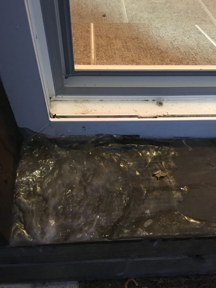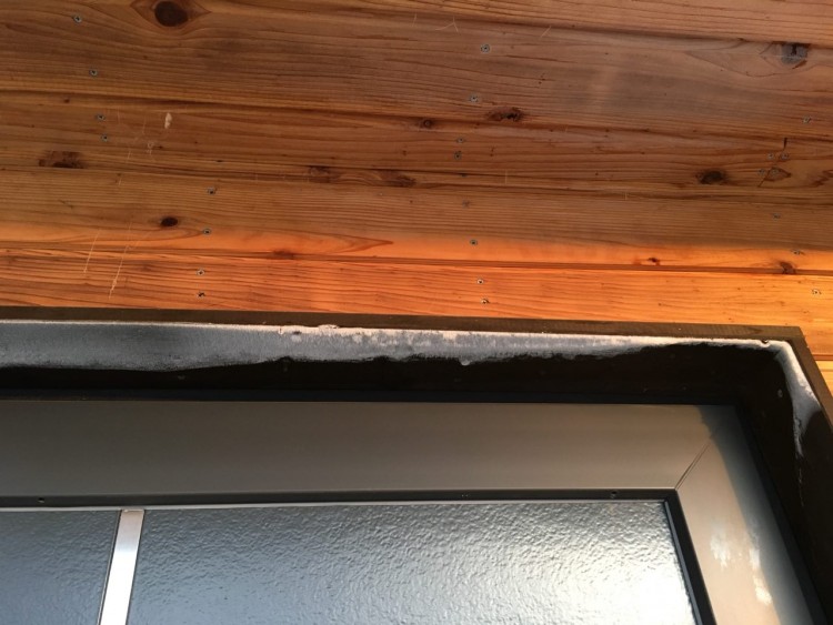 문이 기밀하지 못해 실내 공기가 빠져 나가면서 맺힌 결로가 저렇게 얼어버린 것 같습니다.