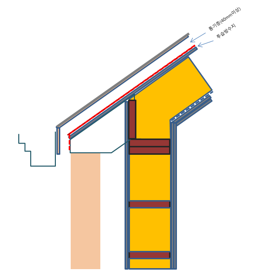 지붕은 제가 올려드린 그림 그대로 입니다. 그림에서 보이는 처마는 .. 처마라기 보다는 하부의 조적을 덮는 것에 불과합니다. 그러므로 통기층50mm 만 외부로 돌출되고, 그 위에 빗물받이가 설치되면 됩니다.