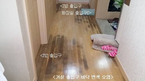 방바닥 모르타르의 잔류수분 증발에 의해 마룻널이 변색된 것으로 추정됩니다.