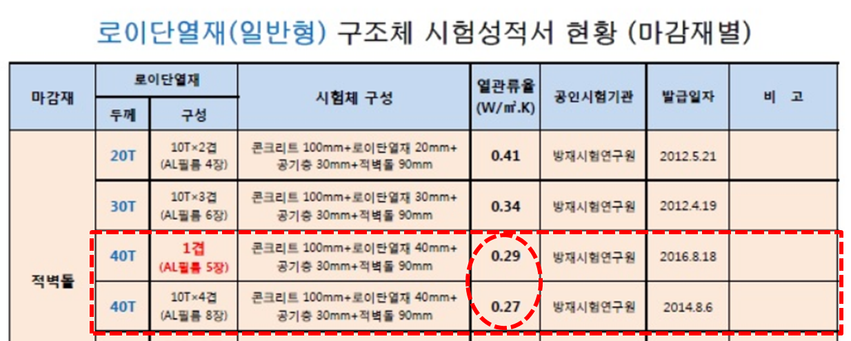 적벽돌 마감 구조의 로이단열재 시험성적서 중에서 공기층을 제외하고 시험한 시험성적서는