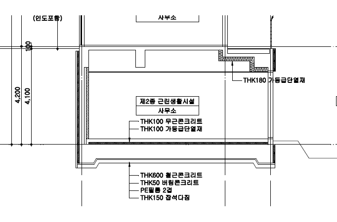 그림을 보시면 지면이 경사지로 한쪽벽은 창문으로 Open되며, 단열재와 지하벽체사이에는 무근콘크리트로 막게 되어 있고, 벽체와의 틈새는 배수로가 있습니다.