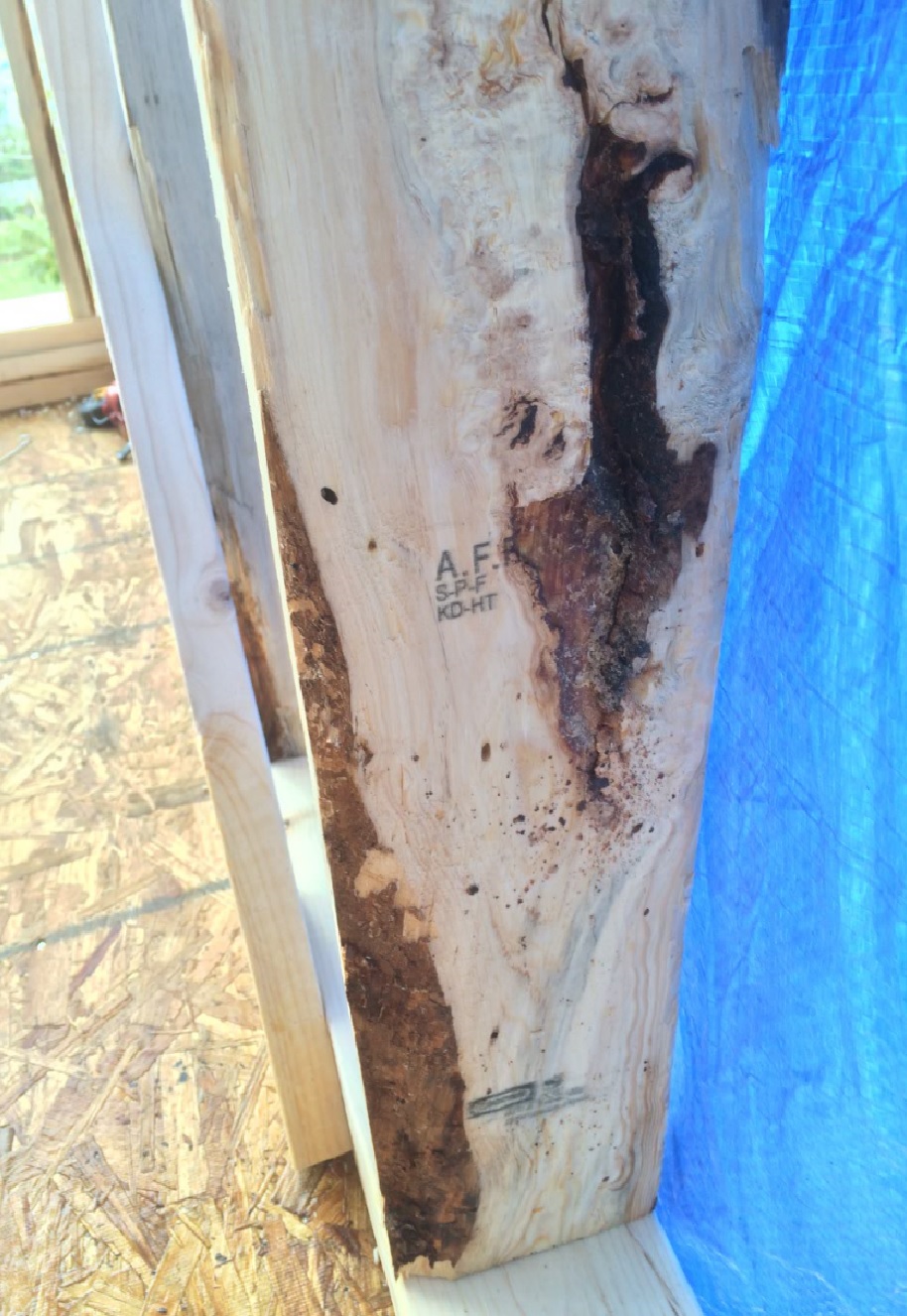 4번사진-목재가 안좋아 보이는 스터드- 캐나다 spf는 육안등급 목재로 피죽의 상태도 체크해서 등급을 메기기 때문에 도장이 찍혀져 있으면 구조적인 문제는 없습니다.