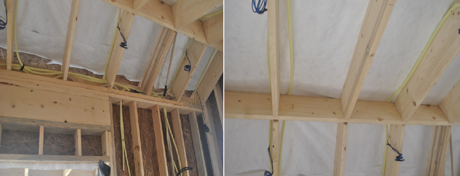 이중지붕을 한다고 하면서 서까래위 타이백을 저렇게 깔아놨습니다.( 남는 타이백들을 모아 대충 깔았을뿐만 아니라 전체 길이도 모자라게 붙여놨습니다.) 그리고 전선 cd관이 용마루 목재와 타이백 사이로 지나가게 배선되어 있습니다.