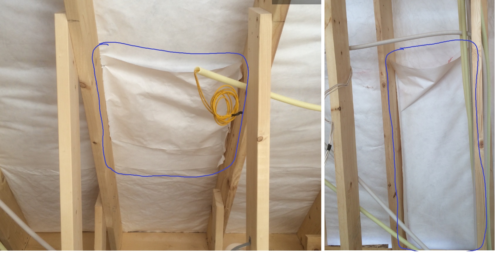 타이백이 서까래 밴트 역할을 하고 있습니다. 그래서 처짐 현장 없이 시공되어야 인슐레이션 작업시에도 작업자에 의해 통기층을 눌러버리는 일이 없다고 알고 있습니다. 그런데 저희 현장은 처짐 현상은 물론 이고 사진(파란색 부분들)에서 보시는 바와 같이 엉성하게 땜질식으로 내부에서 붙여놓은 곳이나 접혀진 상태로 아무렇게나 시공된곳이 여럿 있습니다. 조금만 신경써서 작업했다면 충분히 방지 할수 있었던 일이라 너무 속이 상하네요. 이럴경우 지붕작업 전이라면 합판을 걷어내고 재 작업 하는것이 맞겠지요?