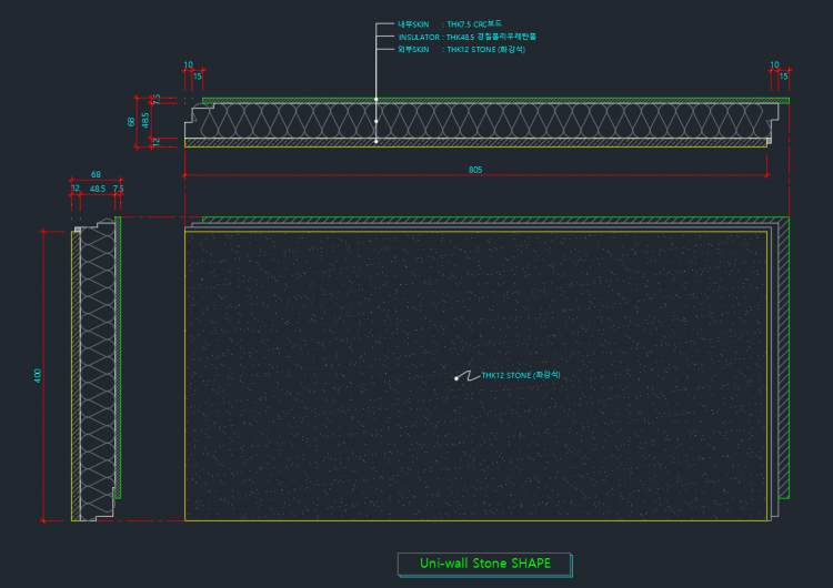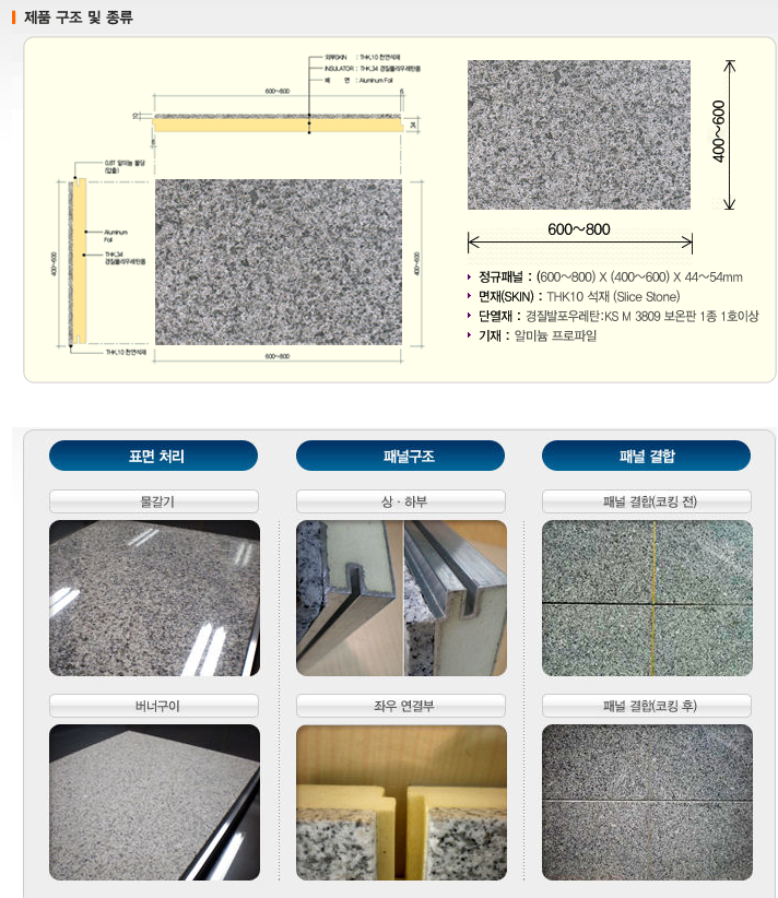 구성은 THK12 화강석+THK48.5 경질폴리우레탄폼+THK7.5 CRC보드로 되어있습니다.