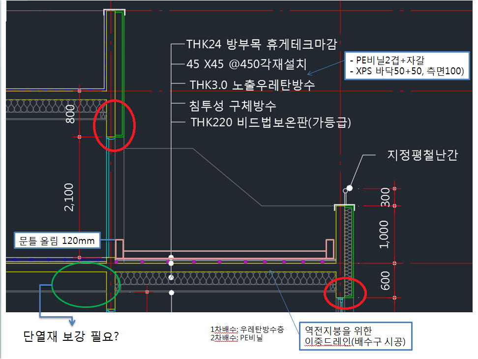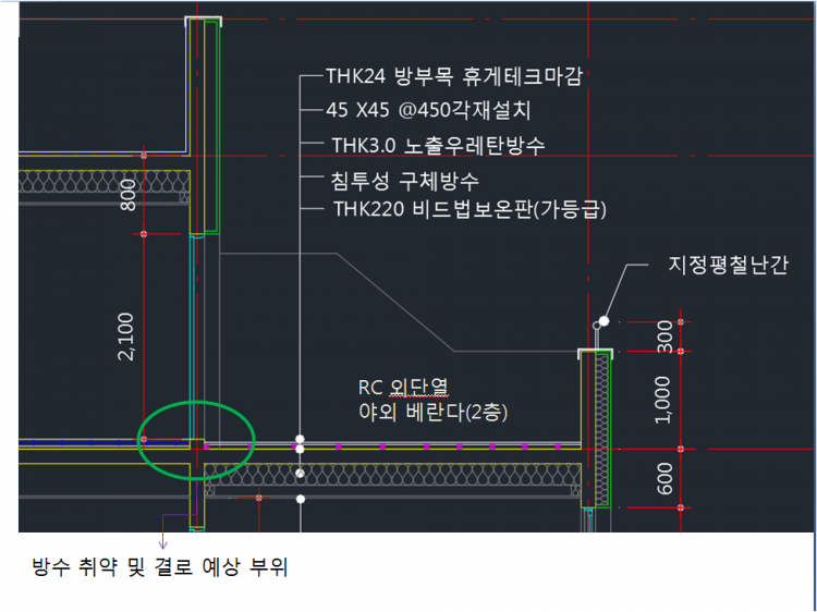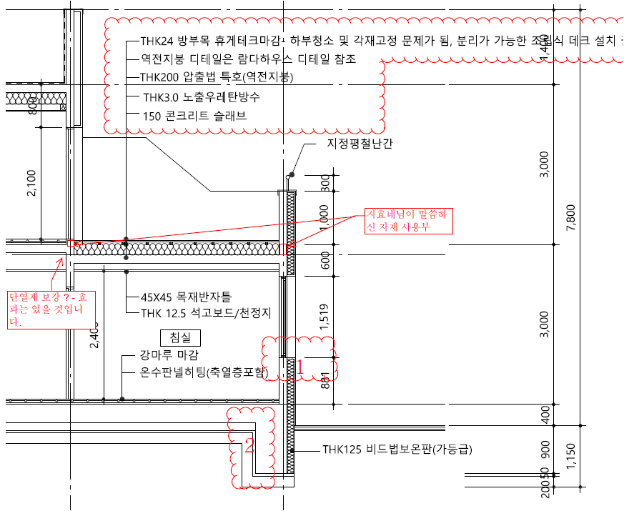 빨간색 동그라미 부분 말입니다. 지금보니 2층 옥상도 외단열이 아니라 내단열이네요. 내외단열을 혼합하면 반드시 저렇게 취약 부분이 생기는 것 같습니다. 베란다를 역전지붕으로 시공하시려면 이왕 하시는 거 옥상도 하시고, 파라펫은 열교차단재로 시공을 하시는 게 맞지 않을까 합니다.