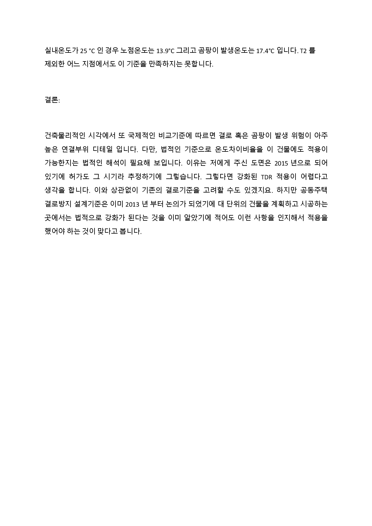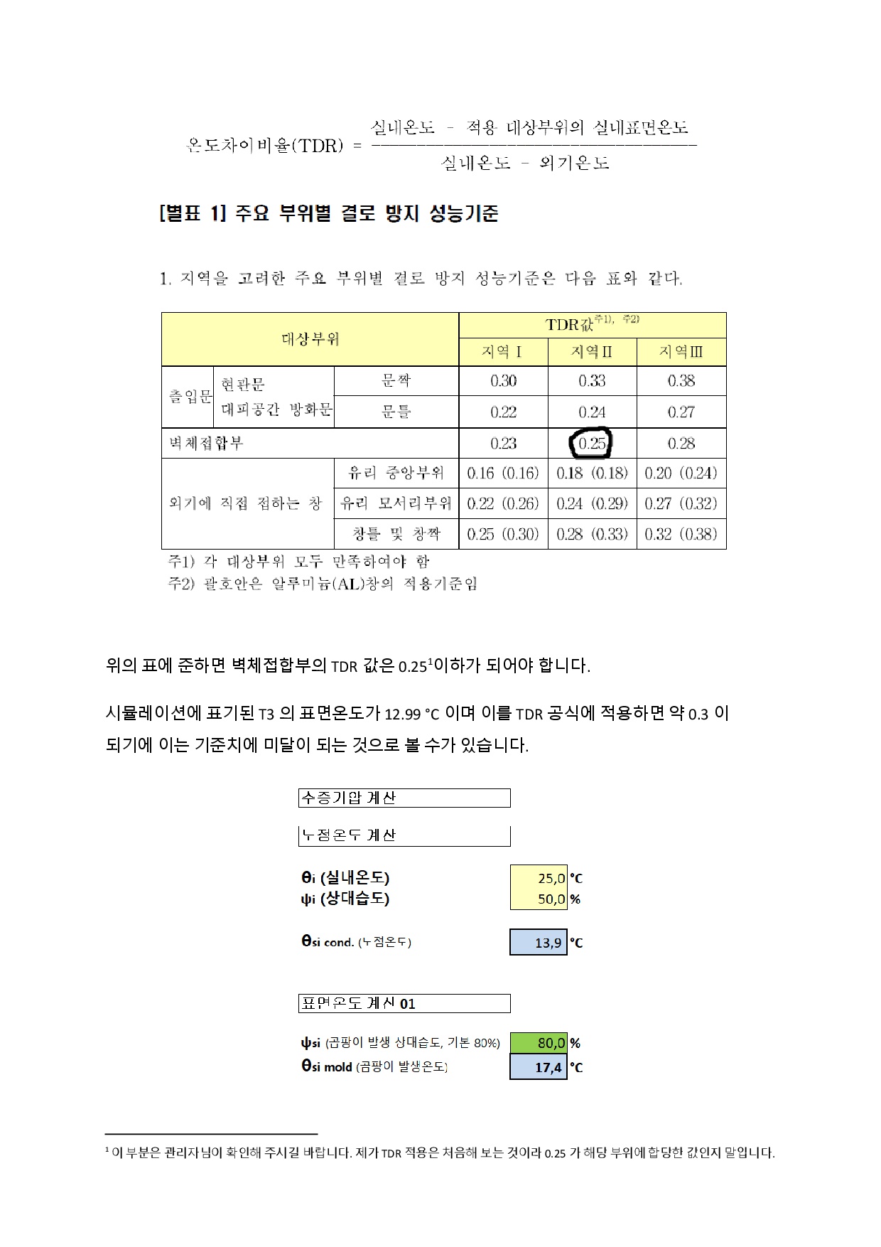 4.     국내기준인 TDR에 따른 판단은 법적으로 이것을 만족하느냐의 문제일 것이고 저는 EN ISO 13788에서 허락한 각 국가별 기준에서 독일의 DIN 기준을 적용했으며 (한국의 기준에 비해 좀 약한 것으로 알고 있습니다.)