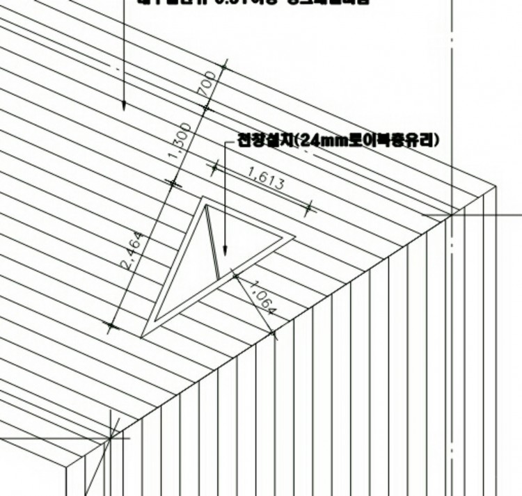 5T+12mm단열감봉+5T+12mm단열감봉+5T(로이)+노튼테이프10mm(내부 실리카겔막놓음) 외부 실리콘으로 현장에서 밀봉+5T+12mm단열감봉+5T로이 그리고 위에 밟을 수 있게 24mm 접합유리(12mm ×2)를 올렸습니다. 천창의 총 크기는 5m×1.2m 정도입니다.