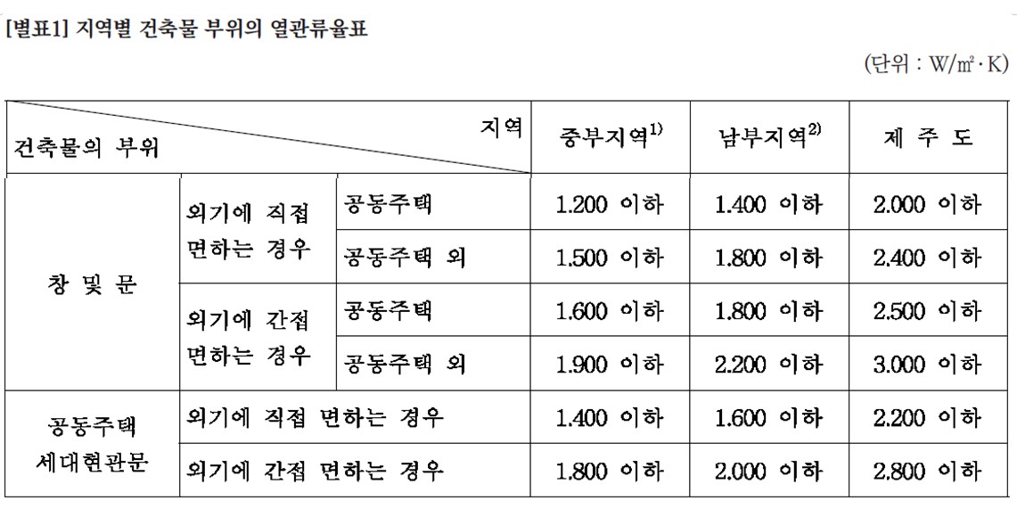 1. 외기 직, 간접에 해당하는 문의 경우 문짝과 후레임을 포함한 열관류율 값이 아래 별첨한 별표1 에 적합하여야 합니다. 따라서 문틀의 채움도 이를 근거로 조치가 필요합니다. 관리자님께서 지적한 철재후레임의 열교현상을 막을 수는 없겠으나 최근 위에 제시한 그라스울이나 미네랄울로 조치합니다.
