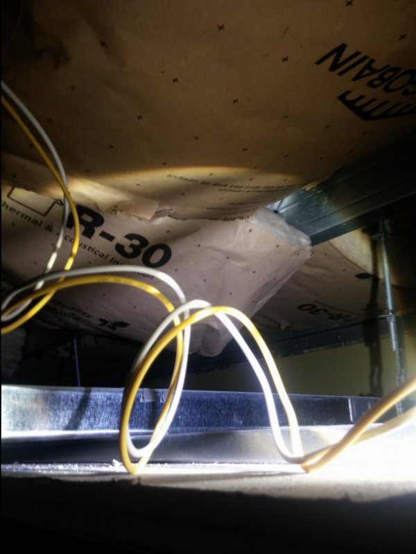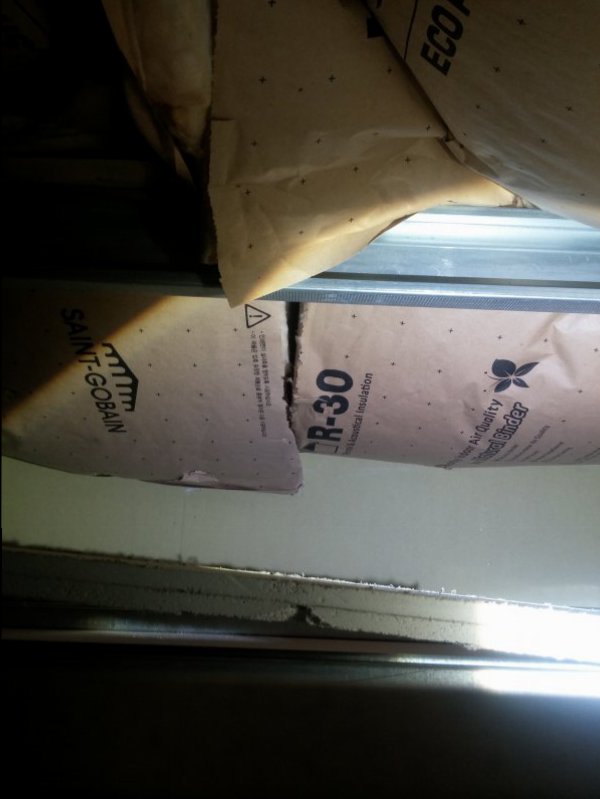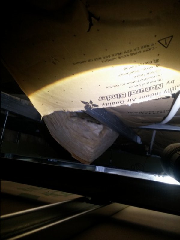 사진은 2층 천장 그라스울 시공인데, 아무런 고정이 되어있지 않고 스터드 사이에 끼워져만 있습니다. 간격을 두고 아래로 석고보드 두장이 시공되어 있습니다.(사진은 에어컨 설치를 위해 석고보드에 뚫어놓은 구멍을 통해 찍은 사진입니다.)