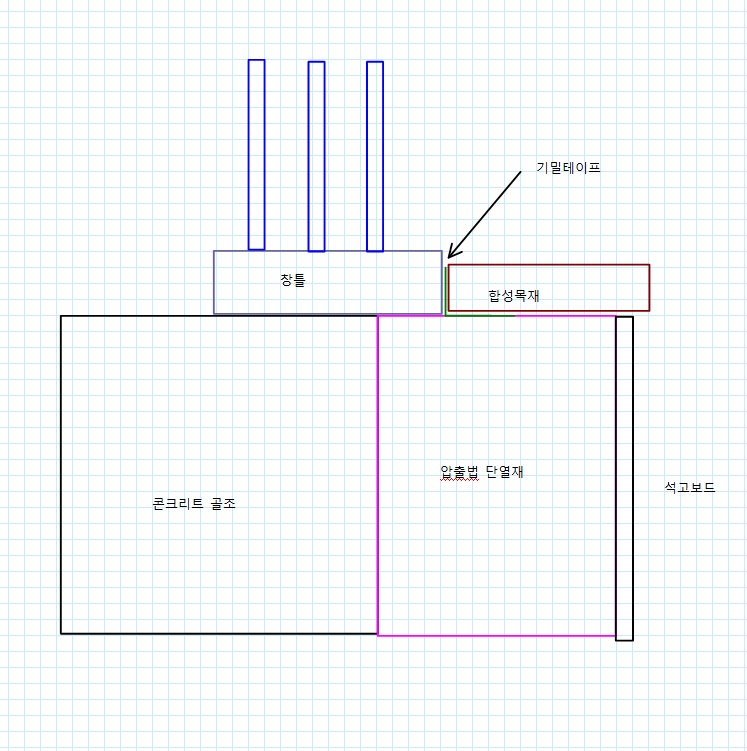 발코니 확장부분 창호 설치 그림을 그려봤는데요. 이것도 문제 없는지 알려주시면 감사하겠습니다. 대표님이 국산창호는 기밀이 너무 떨어진다고 레하우창을 권하셨는데 제가 열교 때문에 걱정하니 통바 넣어서 창호가 단열재 위에 위치하도록 해 주신다고 하셨습니다.