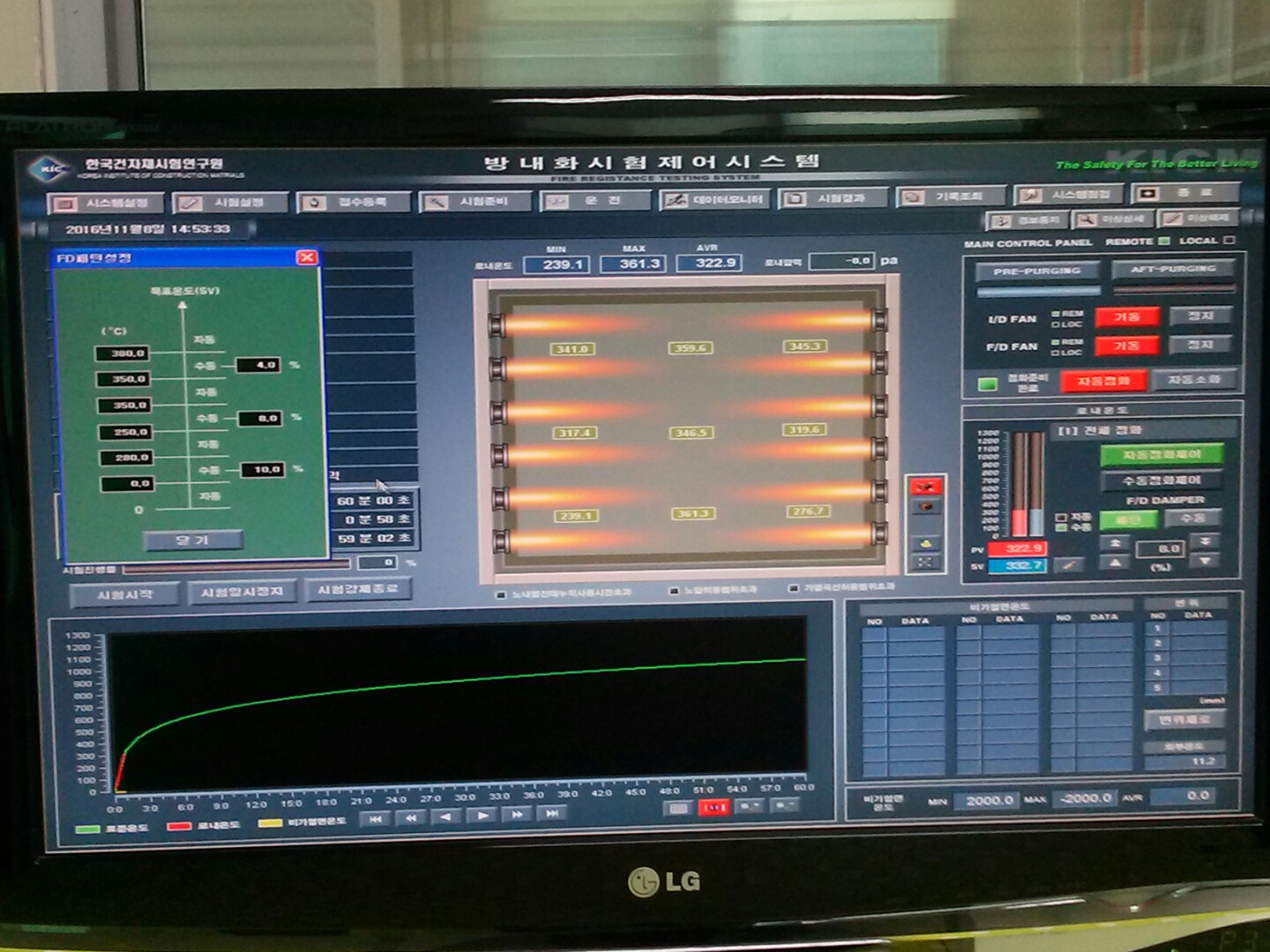 일반 방화문 즉 외기와 관계없는 갑종 방화문은 비차열 1시간으로 열차단은 고려하지 않으나 불이 방화문을 통하여 차폐되어야 합니다. 그것도 모든 금구류를 부착하여 앞면과 뒷면으로 2개소를 시험합니다. 사진은 1시간 내화시험을 하고 옆 표시판에 end가 보일 겁니다. 불이 차폐되어 통과된 겁니다.