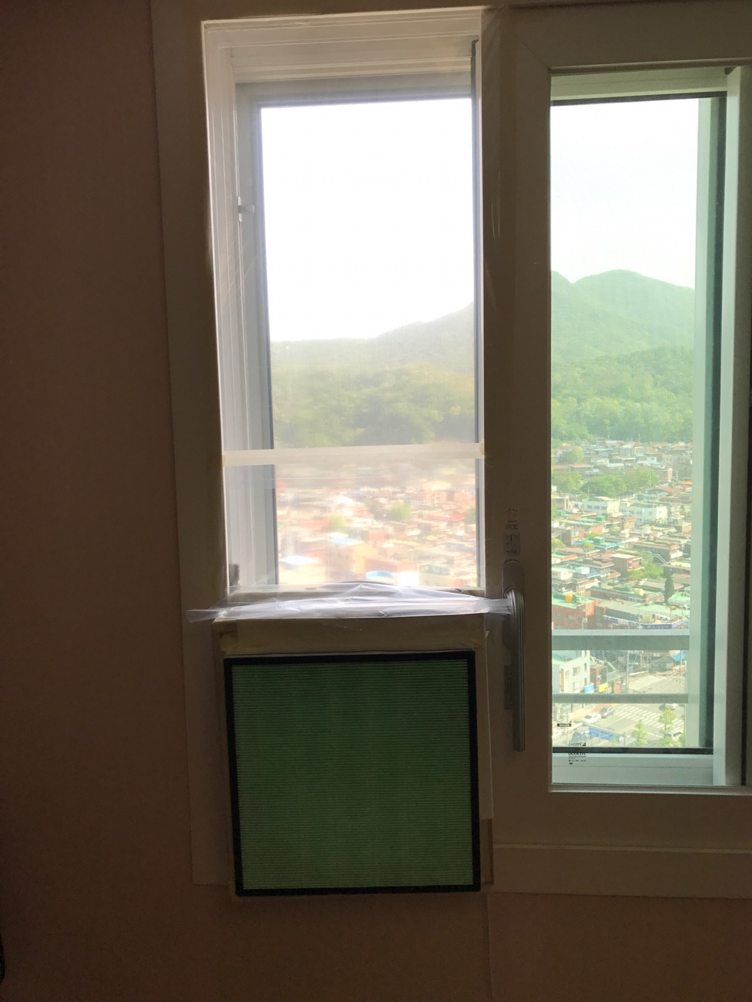 참고로 최근에 인터넷 커뮤니티 사이트를 통해서 사진처럼 환풍기를 이용한 양압환경이 유행이라고 합니다.즉 환풍기 앞이나 뒤에 헤파필터를 달고 급기하여 양압상태로 만드는 상황입니다.이 상태에서 반대쪽 창문을 1Cm정도 열어놓은상태에서  각종 기기를 이용하면 포름알데이드/라돈등을 측정하면 실내 오염물질이 배출되는 상황입니다.ㅎㅎ