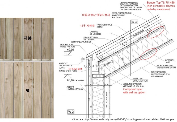 일단 위의 단면은 경사지붕의 각도가 클 경우라도 선홈통에 물이 잘 빠지도록 외벽과 만나는 위치에 홈을 만드는 것이 좋아 보입니다. 비가 적은 지역은 큰 상관이 없겠으나 그대로의 적용은 한계가 있는 디테일로 보입니다.