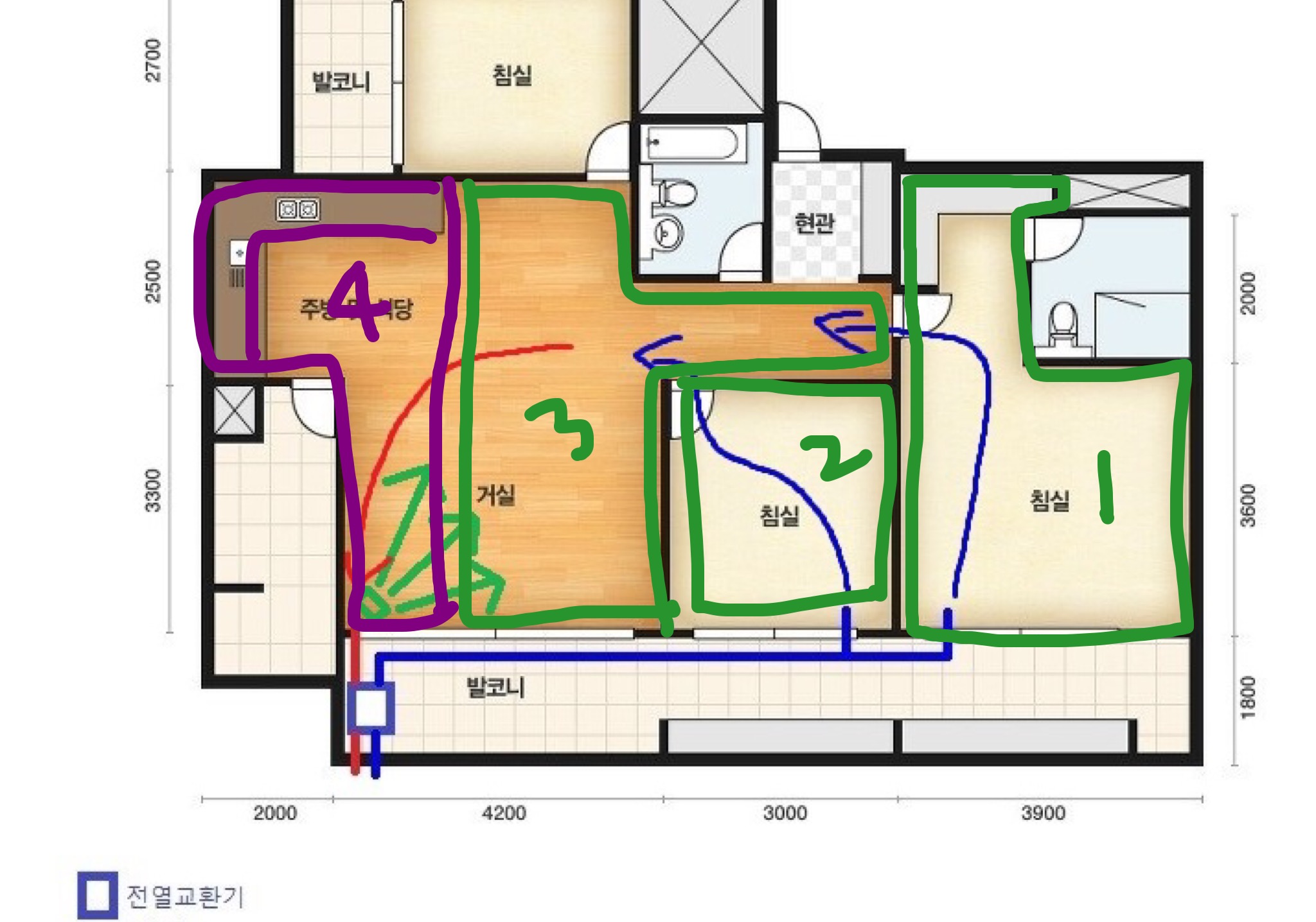 제가 구상한바로는 발코니에 관리자님이 설치하신 모델의 전열교환기를 설치하고 급기를 침실 1,2에
