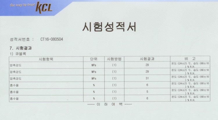 1. 시험성적서로써는 괜찮습니다. 그러나, 벽돌은 그 수많은 제품을 모두 시험성적서를 받지 못합니다. 그러므로 불행하게도 사용하시고자 하는 제품이 이 시험성적서와 일치할꺼라는 보장은 없습니다. 본사차원에서는 제대로 대응이 되겠지만, 대리점에서는 이 것의 일치여부에 별로 신경을 쓰지 않고 있는 것이 현실이거든요.