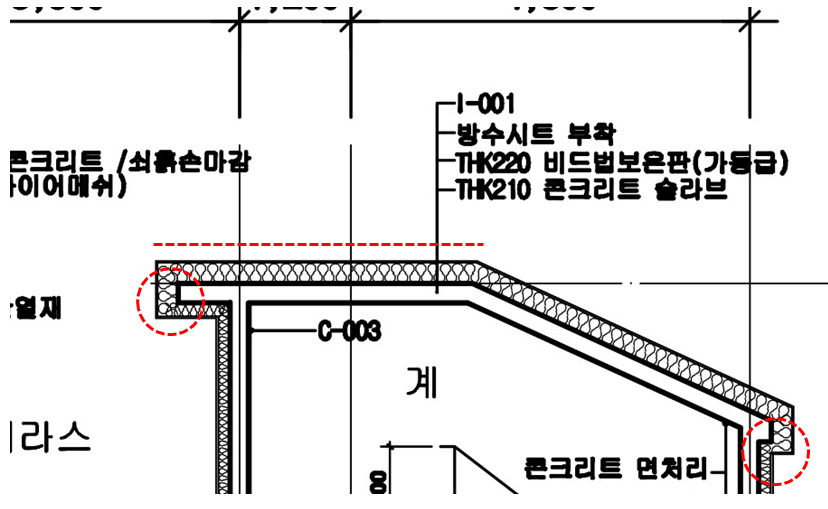 붉은 색 직선 부분은 그 경사도의 낮음으로 인해 아스팔트슁글 시공이 불가능한 부분이며, 원형으로 표기한 부분은 그림처럼 시공이 아예 불가능한 부분입니다.