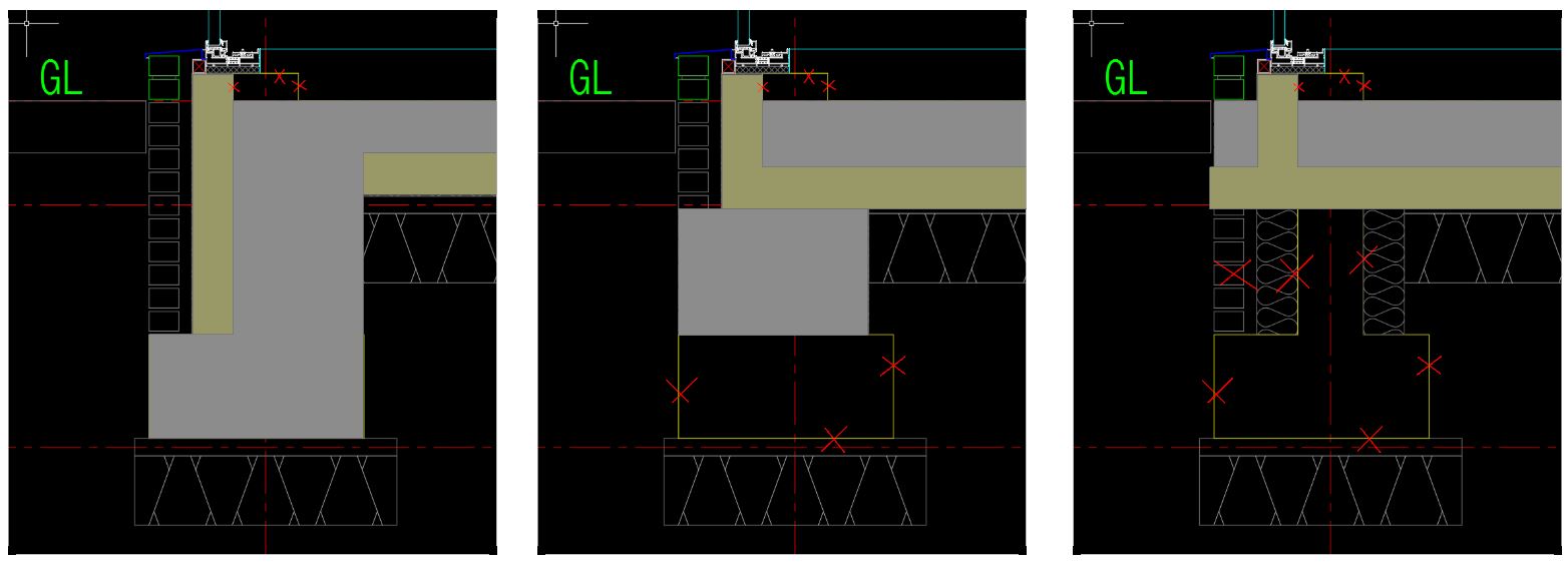 3 과 2의 다른점은 2의 턱 밑에 기초를 연결한것 밖에 없는데요.. 시공은 가능하나, 구지 이렇게 하는 이유를 모르겠네요. 공사비, 열교 모두 낭비 같습니다.
