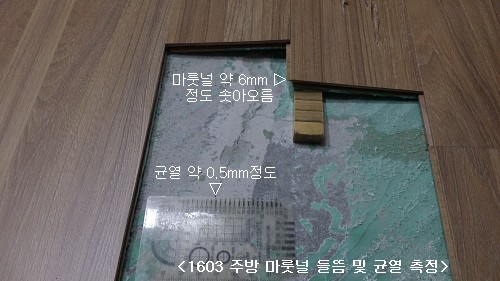 지난 2월 현장실사를 했던 방바닥 마감재인 마룻널이 들뜬 것으로써, 그 단초는 방바닥 모르타르의 작은 균열을 통해 층간 차음재와 기포 콘크리트 그리고 시멘트 모르타층의 잔류수분이 집중적으로 작용하여 발생된 것으로 추정되었습니다.
