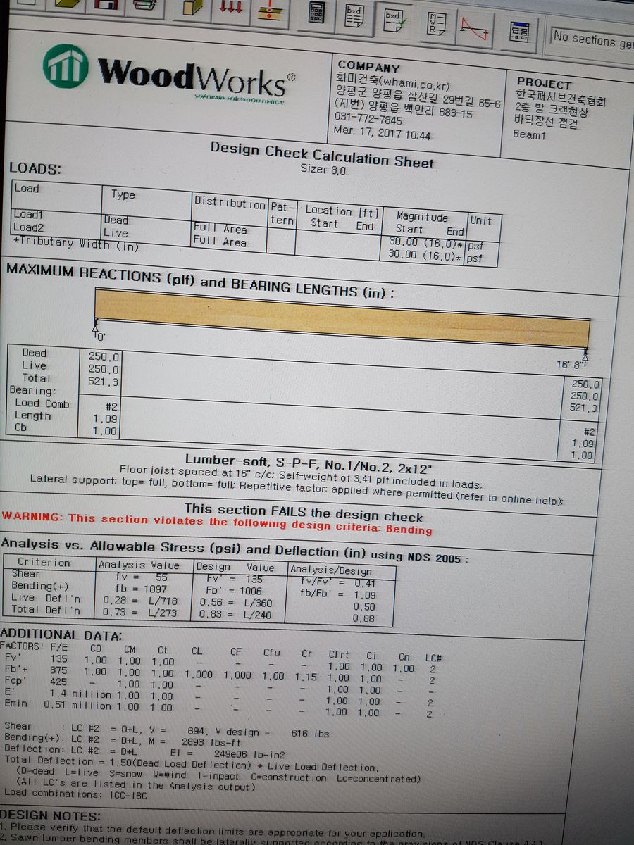 허나 지금 상황만 놓고 보면 2x12-16"(406) 최대길이5088, 몰탈하중만이 심하게 처짐에 영향을 주지는 않을 것 같구요. 또 하나는 크랙의 방향인데요, 처짐이라면 처짐이 심한 중앙부위 쪽으로 크랙이 가야하는데 사선방향으로 크랙이 간 것 같구요. 처짐이라면 몰탈을 붇는 과정에서 처졌을텐데 이렇게 솟아오르는 현상이 아니라 아래로 처지는 모양이 되어야 되지 않나 생각합니다.