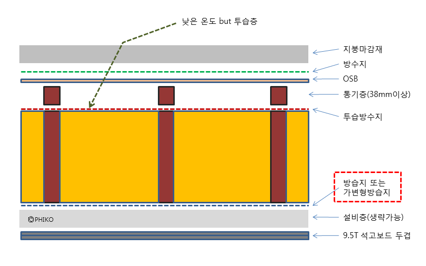 이게 맞다면.. 외부에 통기층이 누락되어져 있습니다. 지붕마감재가 불투습에 가까운 것도 그렇지만, 여름철 일사에 의한 영향에서 최대한 벗어 나기 위해서라도 통기층이 존재해야 합니다.