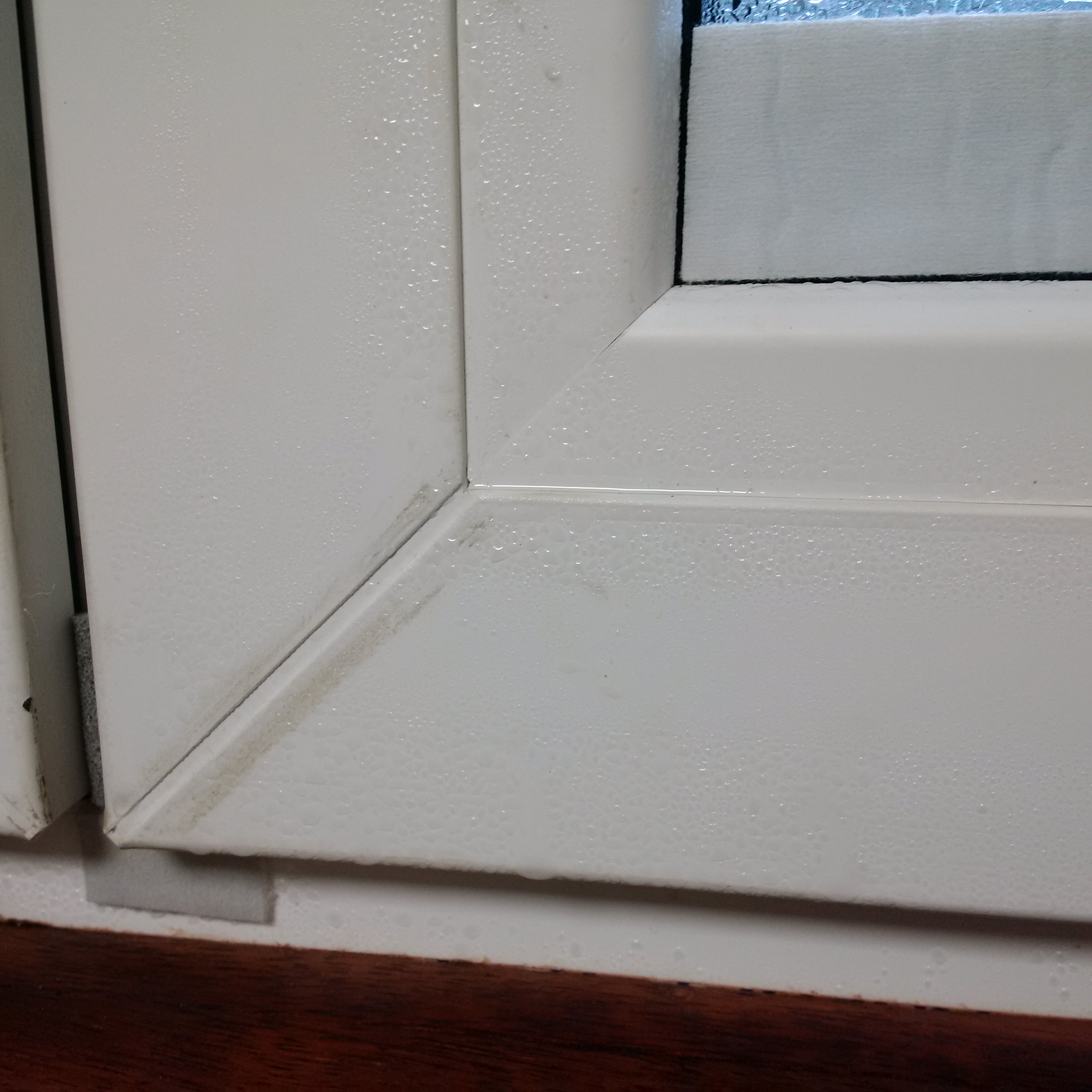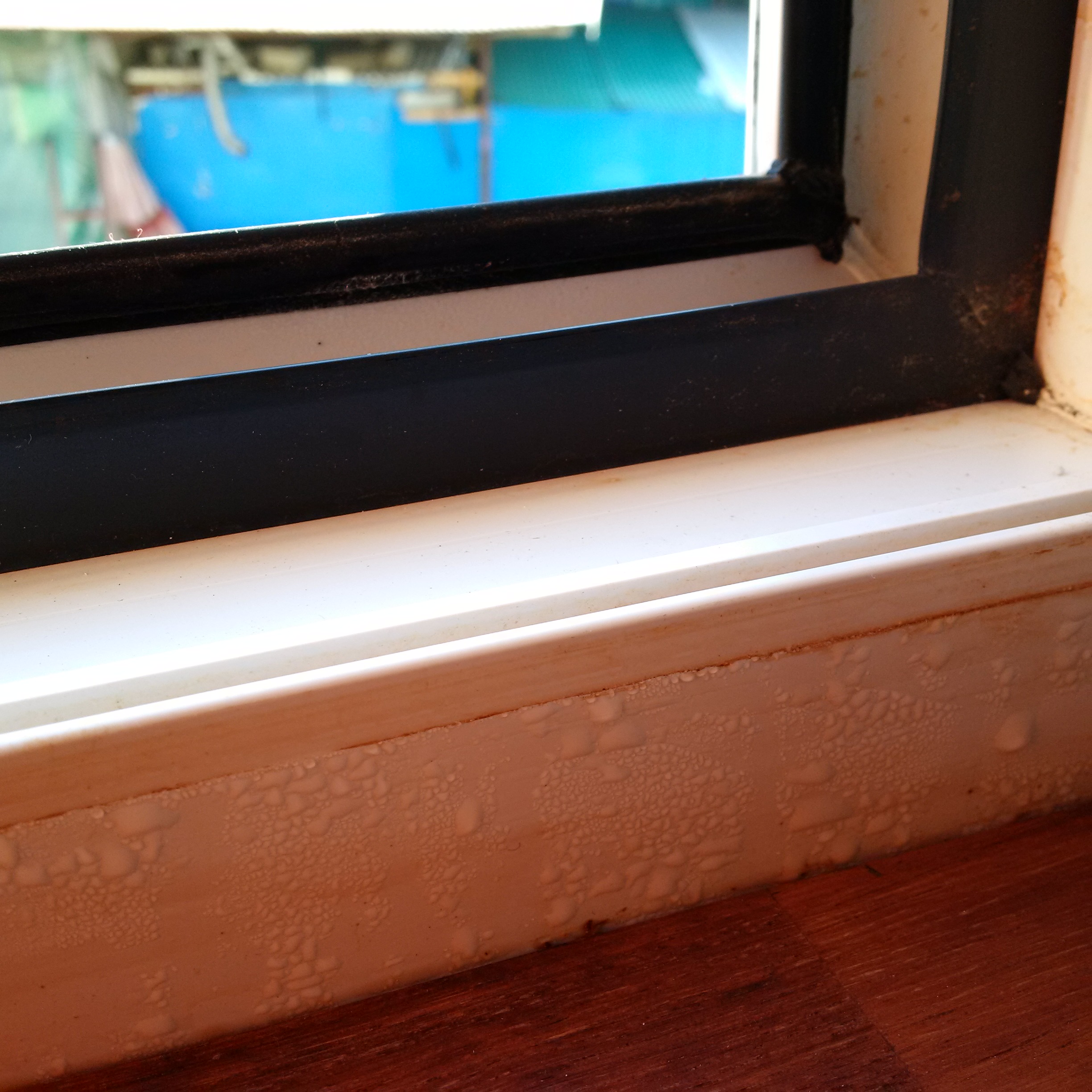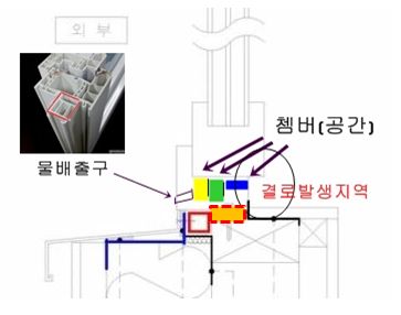 독일식 창호로 빗물받이를 설치된 창호를 사용하고 있습니다. 겨울이 오면서 실내 쪽 창호 하단에 결로가 많이 나타나고 있습니다. 독일식 창호로 창틀 내에 3군데의 쳄버가 있으나 맨 앞쪽은 물배출구가 2군데 있어 바람이 들어오는 상태이고 쳄버 사이에는 고무 가스킷으로 공기이동이 힘든 구조입니다.