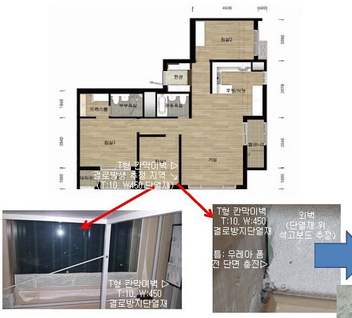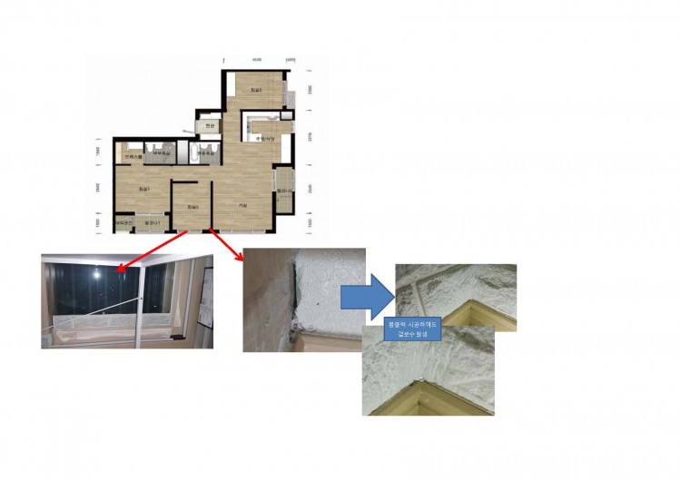 첨부의 사진과 같이 침실3의 경우 벽체 코너쪽 결로에 의한 곰팡이가 발생하여 벽지를 뜯어 보니
