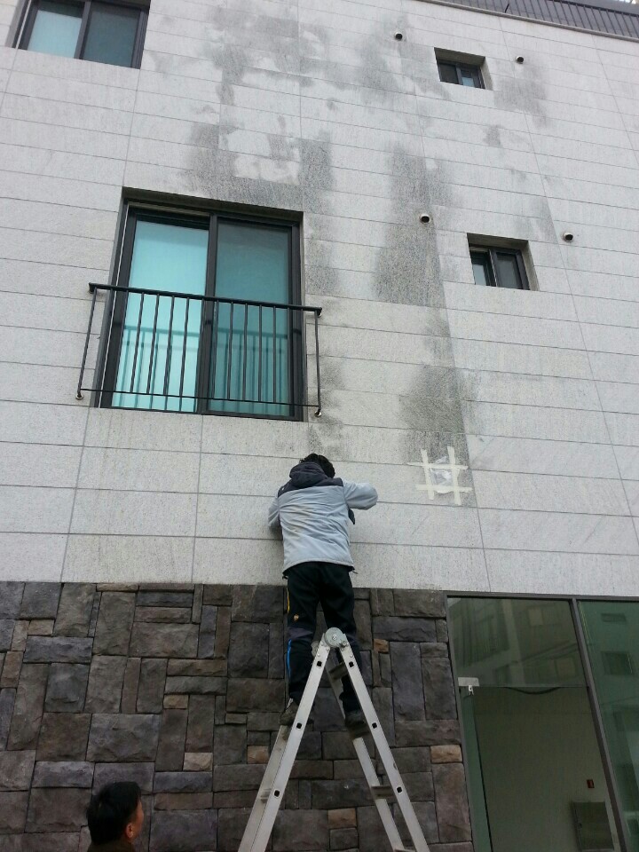 그이후 올해 4월달부터 건물외벽에 검은색 기름같은 얼룩이 나타나였고 날씨가 추워지기 시작한 1달이내전부터는 색감도 진해지고 오염 범위도 커지고 있습니다