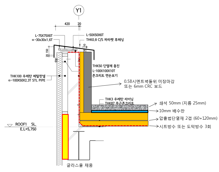 내단열(THK120 단열뿜칠)+THK250콘크리트슬래브+복합시트방수+THK10보호판+THK87무근콘크리트+THK3우레탄 라이닝