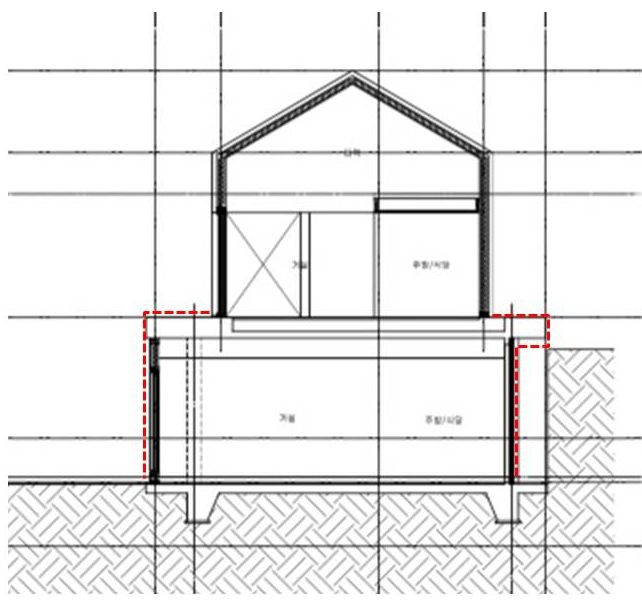 4. 사진을 보시면, 1층 전면부는 확장을 해서 슬라브와 끝선을 맞추어 외단열로 이어질 수 있겠으나 옆의 방 같은 경우는 슬라브보다 안쪽으로 방이 들어가 있어서, 이쪽은 또 슬라브 아래까지 단열재를 대서 방의 천정까지 내단열이 들어가야 하는건가요?