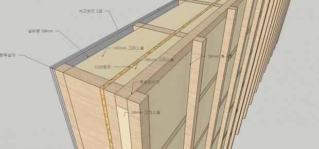 OSB에 2인치 각상을 대고 그 안에 추가적으로 글라스울 단열재를 넣고 투습방수지+통기층