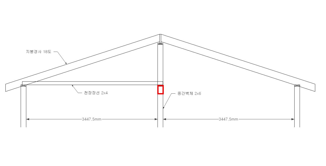 중간벽체를 이용해 왼쪽 공간에 천창장선을 걸 수 있도록 하고, 동시에 중간벽체를 마룻대까지 올려 마룻대를 받치려고 합니다.