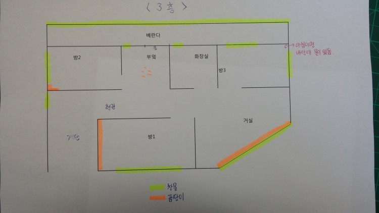 방3 :여긴 다행히 곰팡이는 보이지 않지만 아침이면 모서리 바닥에 물이 있고 창문틀의 실리콘 부위에 곰팡이가 생겼습니다.(물이 왜 생길까요?)