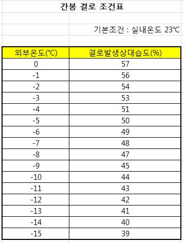 아예 실내온도를 23℃로 고정해 놓고 외부온도에 따라 창호하부 '간봉'부위에서 결로가 발생하는 습도 조건을 테이블로 만들어 보겠습니다.