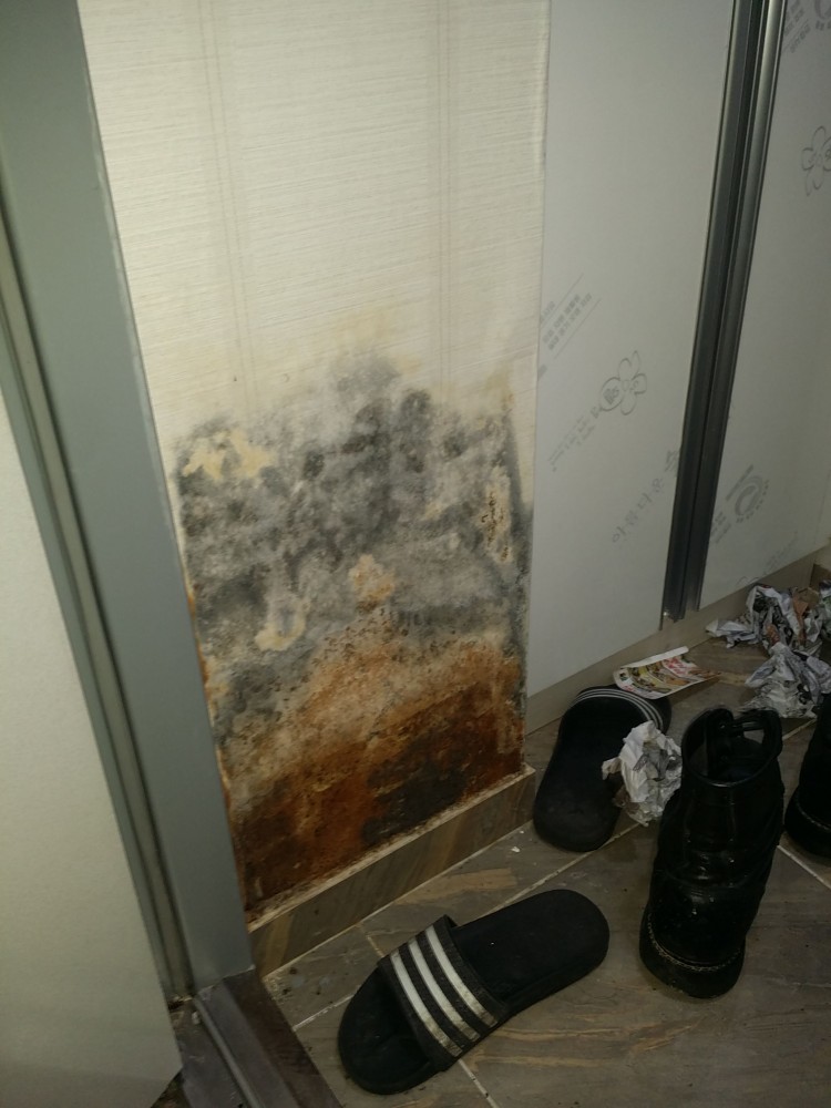 2) 곰팡이 덮힌 부분도 곰팡이 제거 후 말린 뒤 곰팡이방지페인트를 바르고 단열재(20mm)+벽지 붙이기