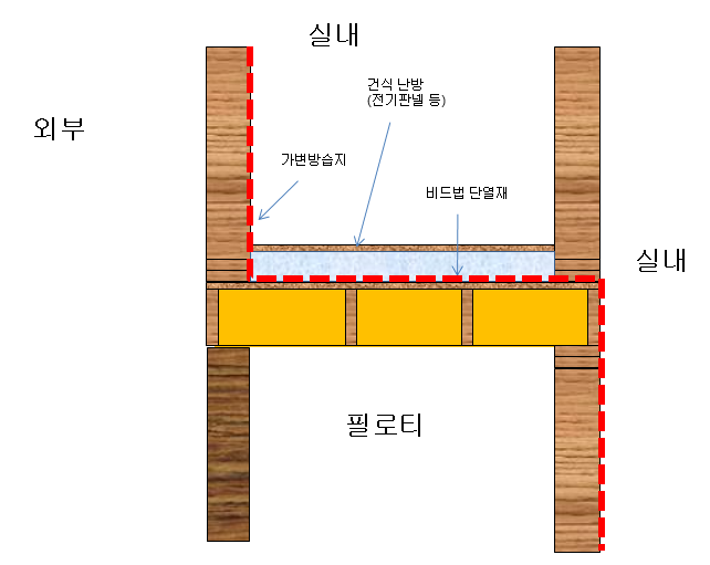 1) 필로티 상부 바닥: 건식 난방 (전기 판넬 등)을 사용할 계획입니다.