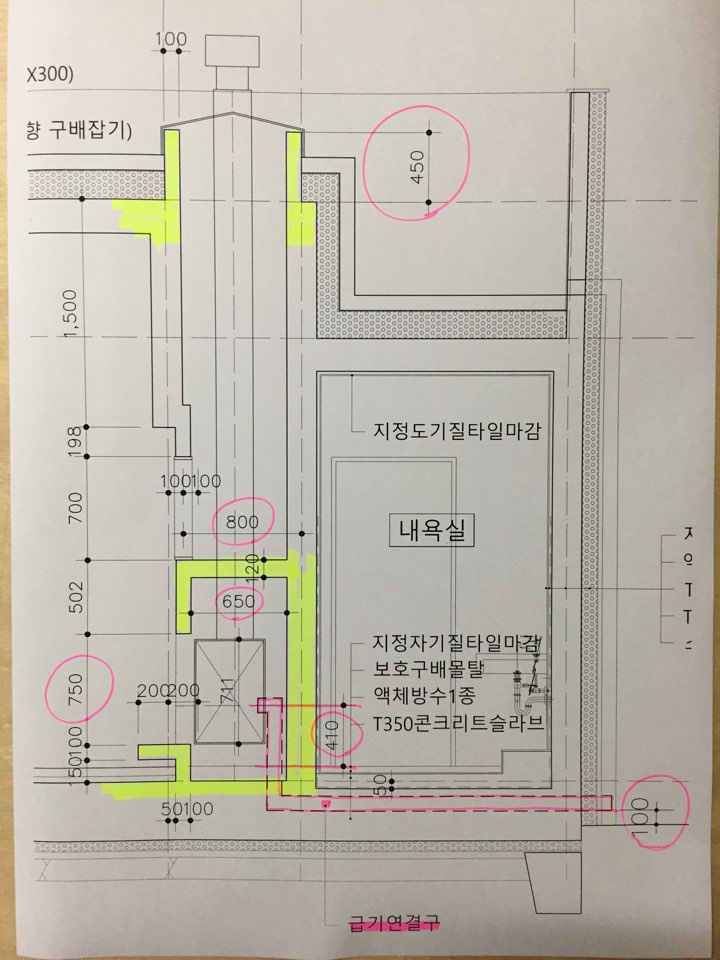 그래서 급기관을 바닥슬라브에 묻어 매트기초의 벽면으로 급기구를 설치하기로 하였습니다.