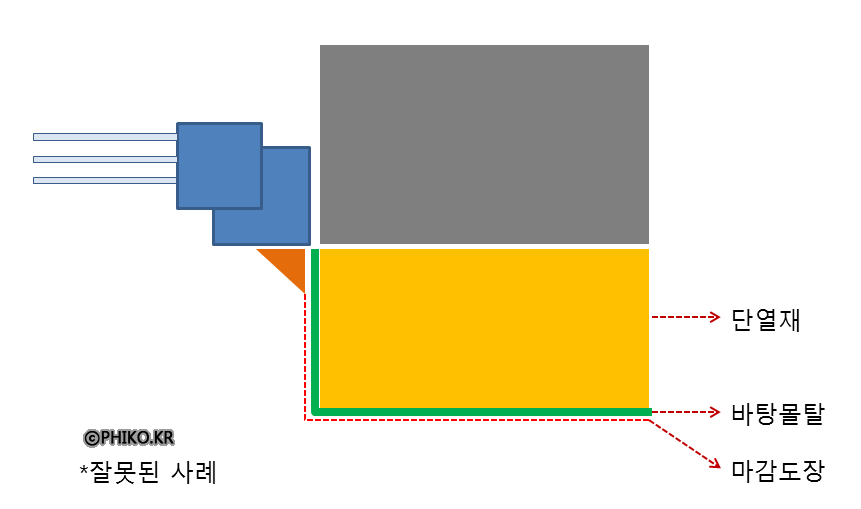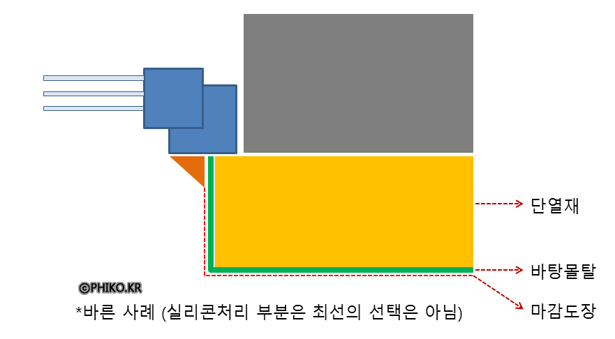 즉, 마감도장에는 실리콘이 붙지 않기 때문에 바탕몰탈에 실리콘을 처리해야 하는데, 이 조건이 어느 방법을 쓰든 동일하다는 의미입니다.