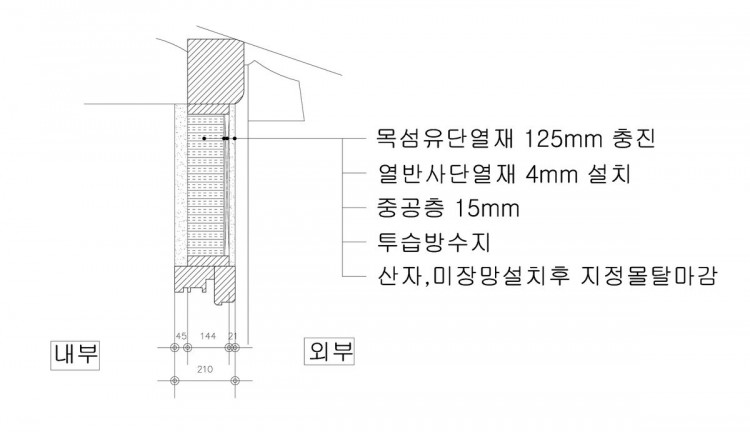 습환경의 가장 원칙은 외부로 갈수록 투습이 잘돼야 한다는 것인데 위의 구조는 정반대의 경우로 단지 단열성능만 생각해서 210mm의 외부벽체에 맞추겠다는 논리에 불과합니다. 외부의 알루미늄은 습기가 동과할 수 없는 그런 막을 형성합니다. 유리, 쇠, 알루미늄이 다 불투습 자재입니다.