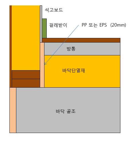 시멘트 방통층과 경계단열재를 고려한 연결 부위 해결은 여러가지가 있겠지만 개인적으로는 시멘트 방통층의 열적 팽창과 수축 그리고 단독이라 할지라도 뜬구조를 위해서는 XPS로 경계단열재를 설치하는 것은 폭변화를 상쇄하기가 부족하기에 아래와 같은 PE 재질을 사용하는 것이 좋다고 봅니다. 몾조에서는 정확히는 모르겠지만 시실러라 부르는 것 같기도 하구요!