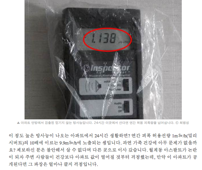 "이 정도 높은 방사능이 나오는 아파트에서 24시간 생활을 하면? 연간 피폭 허용선량 1 mSv/hr 의 열배에 이르는 9,9 mSv/hr에 노출되는 셈입니다."