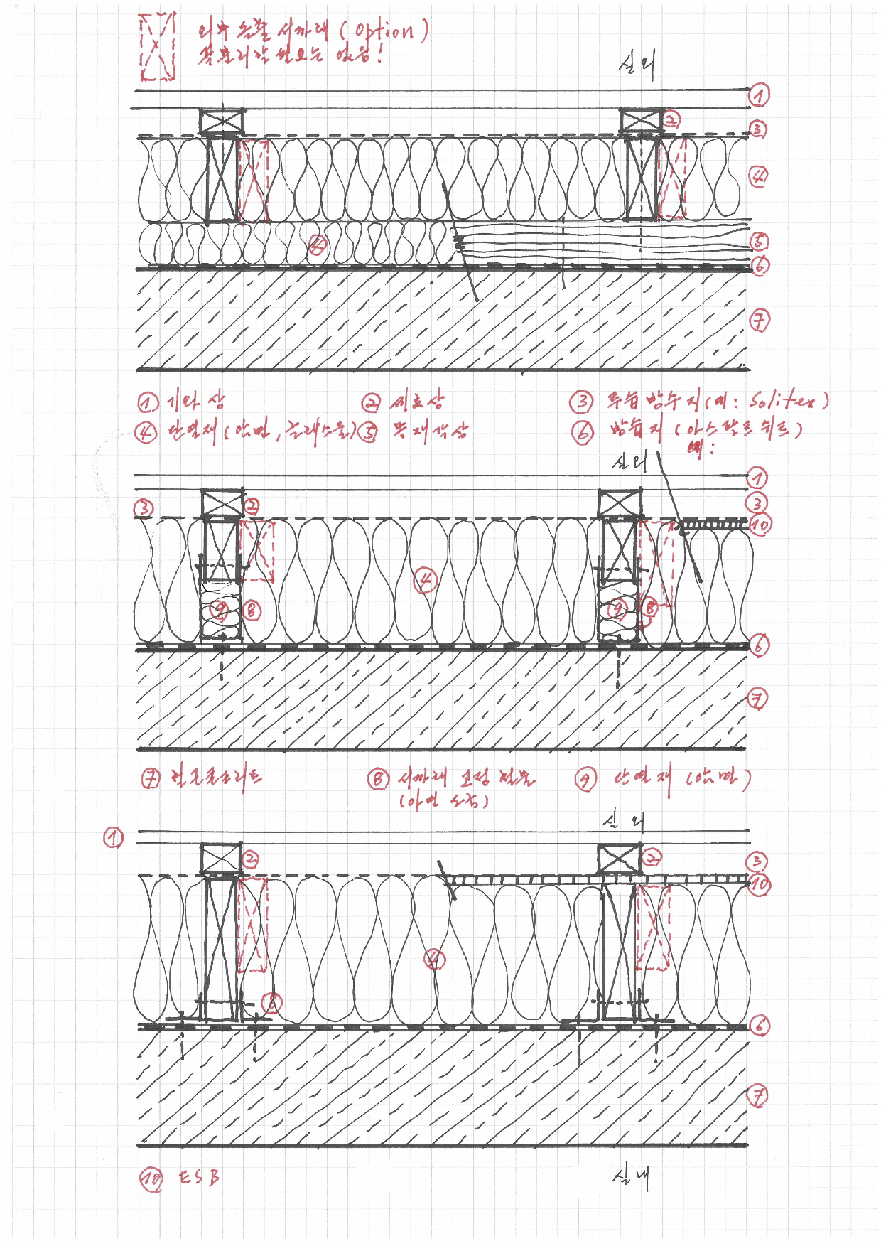 여기의 사례에서 주의할 것은 warm roof와 cold roof가 같이 병행하는 것으로 cold roof의 물성이 있기에 설치되는 단열재는 암면이면 방풍과 방수의 기능이 있는 맴브란이 부착된 단열재이며 폴리우레탄의 계열이면 알루미늄의 보호층이 설치되어 있습니다. 물론 단열성능을 높이기 위한 이유도 있습니다만 그 사잇공간으로 눈이나 빗물 유입이 있을 수 있기 때문입니다. 보통은 warm roof한 방식으로 공사가 돕니다. 참고 바랍니다.